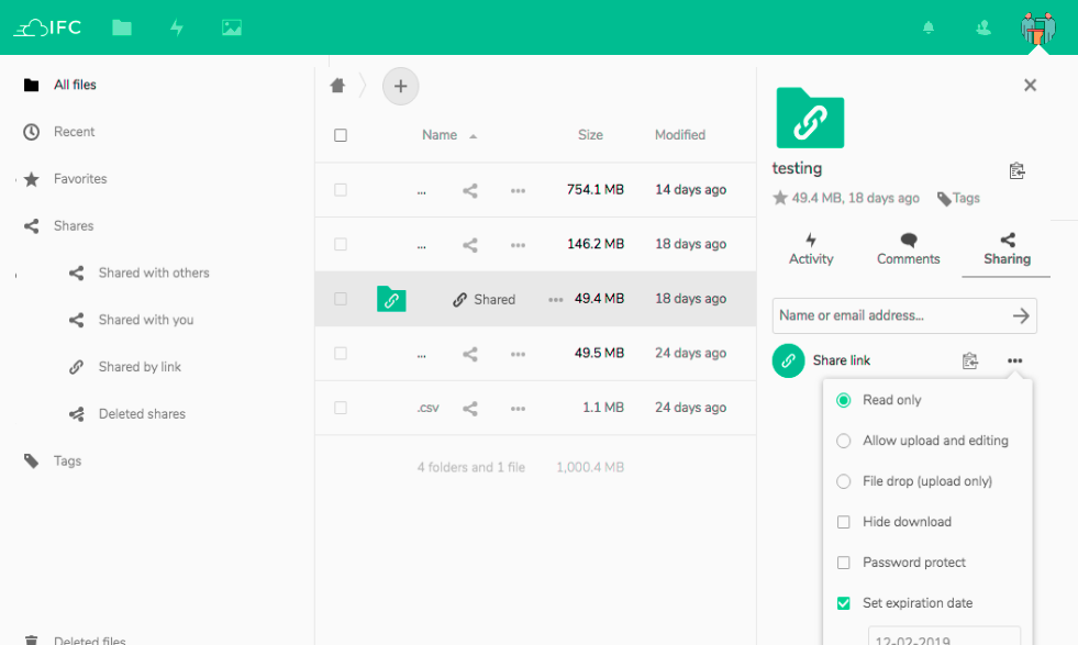 As an administrator, you can set specific permissions on the sharing and access of files. With that being said, permissions of underlying storage will be respected by ifcdata.
