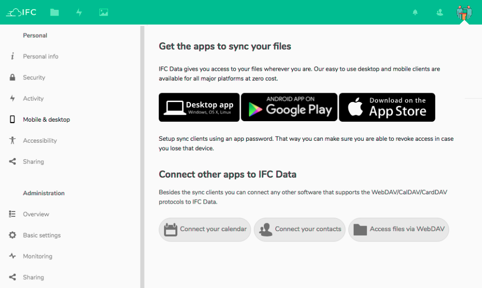 Using an encrypted connection, IFCDATA Files clients for iOS, Android and desktop systems provide users with the ability to share and sync files in a secure environment. This feature supports automatic video and picture uploads, which can seamlessly synchronized to selected folders.